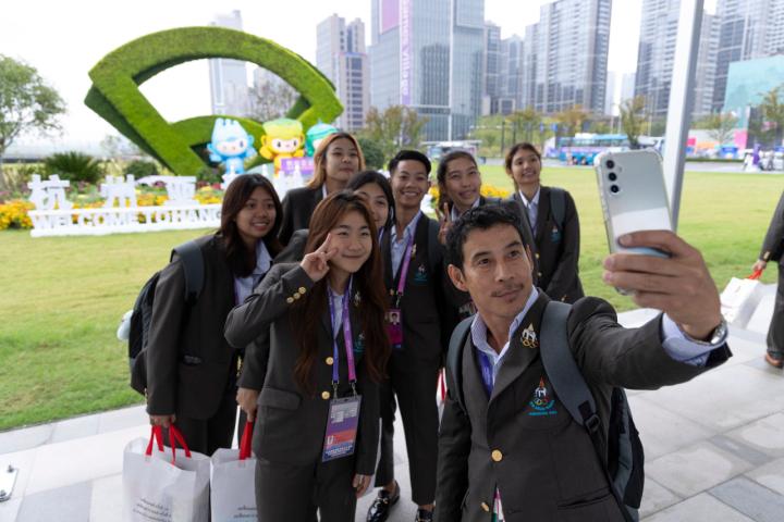 泰国击剑队进亚运村前大家争相和亚运吉祥物留下合影。记者 倪雁强 王建龙 摄