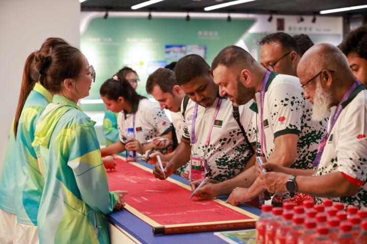 各国(地区)代表团运动员、代表团成员在亚运村志愿服务中心写留言。拍友俞晓涵/摄