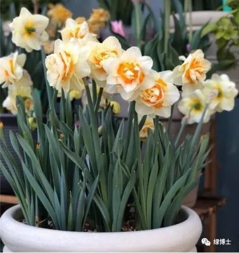 洋水仙是石蒜科水仙属植物,鳞茎卵圆形,常单个或2个基部相连;鳞茎外膜色浅而薄。洋水仙的叶片呈宽线形,叶色绿中带蓝灰,给人以优雅端庄的感觉。和我们春节时的中国水仙不同,洋水仙不仅株型和花朵较大,而且花朵的副花冠的花色和形状多变。