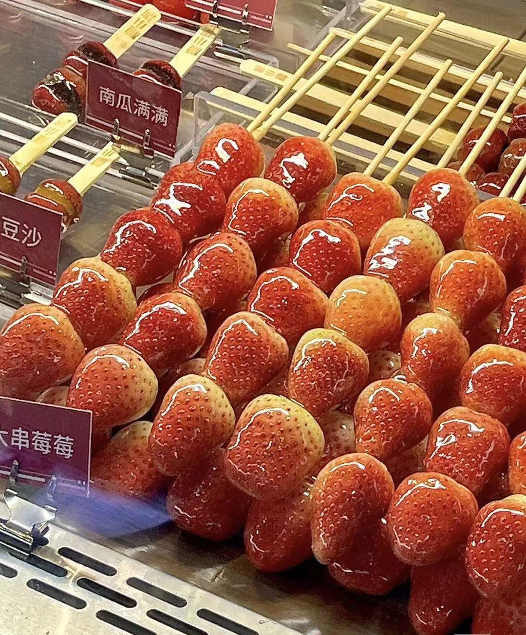 甜甜的糖稀包裹着酸酸的山楂,山楂清爽的酸意与甜味糖衣混合成独特的口感。新鲜的青提和草莓一口爆汁,清爽又解腻……天冷的时候来上一口,能甜到心里。