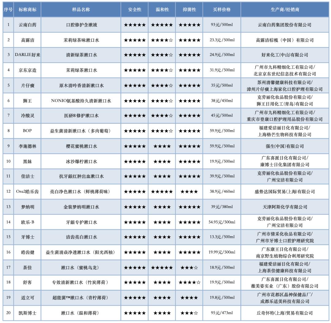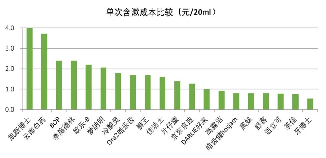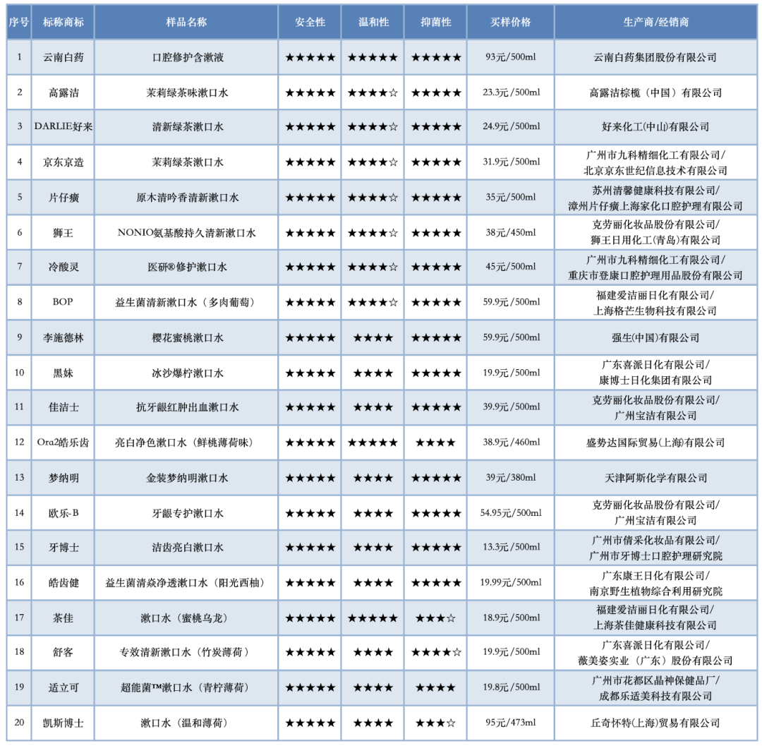 近期我们委托宁波海关技术中心对20款漱口水产品开展实验室检测。买样价格在26.6-200.8元/升不等,如果每次含漱20ml漱口水,单次成本在0.5元至4元。