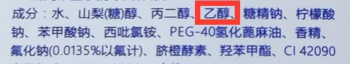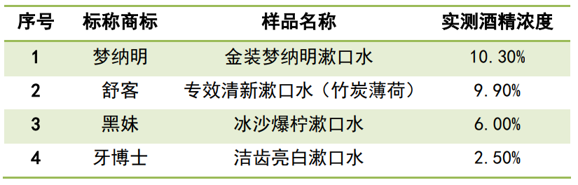 相关标准对于漱口水中的酒精浓度并无限制,适度添加可以起到助溶或抗抑菌作用。查看样品瓶身成分表发现,有4款明确标示含乙醇(酒精),实测浓度在2.5%-10.3%。