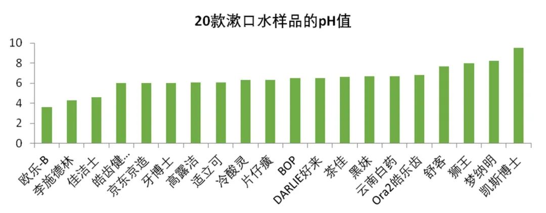 相关标准要求漱口水pH值应在3.0-10.5,实测样品pH值在3.6-9.5,均在标准要求范围内。