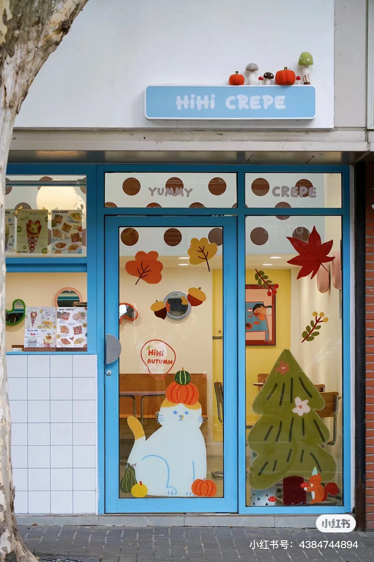 可爱的猫猫戴着南瓜帽子,蹲在圣诞树旁,树下松鼠正在觅食,天空中秋叶纷纷扬扬……康定路上的可丽饼店HiHi Crepe贴上了全新橱窗装饰,据了解,这些装饰贴纸的设计均出自店家之手。谁说秋天一定是个深沉的季节,可可爱爱也能担当主角。