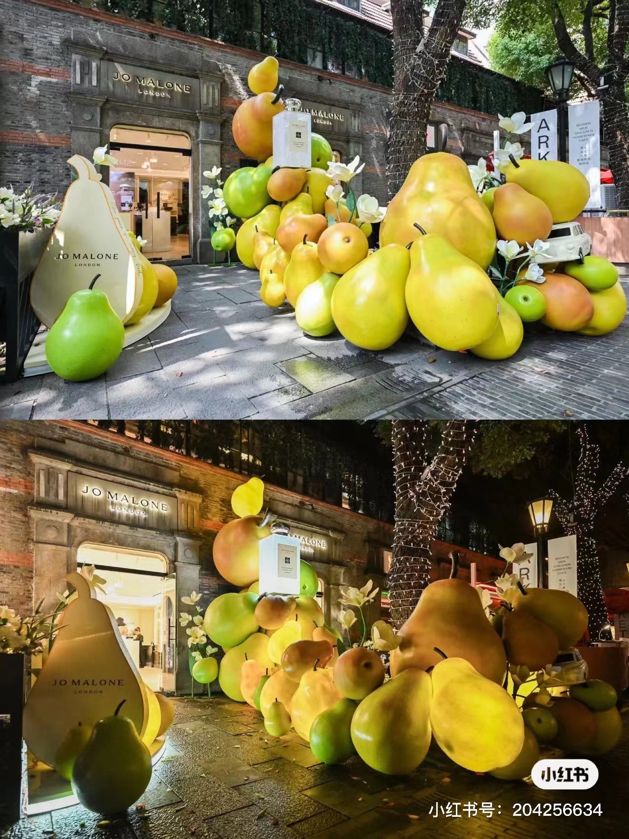 巨大的甜梨模型聚集在一起,好似瀑布一般,位于上海新天地的祖玛珑品牌店在甜梨的簇拥下,成为来往行人关注的焦点。柔和的阳光下,香豌豆纷繁的花瓣在甜梨之间的缝隙中开出漂亮的花朵,好似放大了的童话场景。夜间亮灯以后,宛若梦境般的柔美让画面更添一份浪漫。