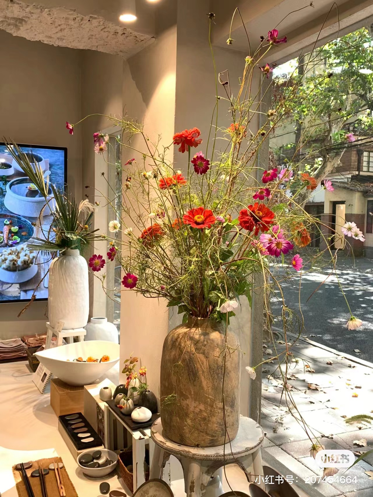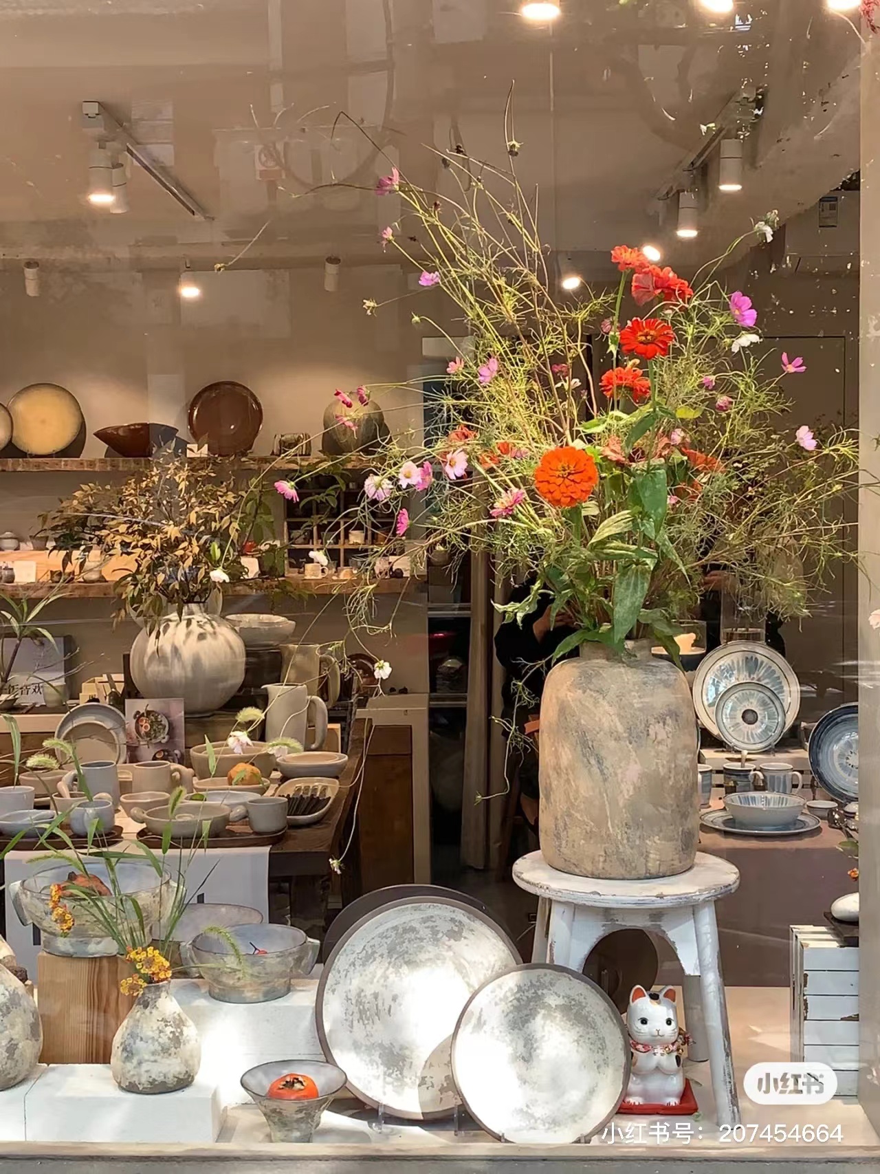 富民路上的陶瓷店Hitable门面以水泥灰为主色调,干净素雅。橱窗里的展示台摆放着同色调的陶瓷餐具与插花作品,缤纷的色彩从整个画面中脱颖而出,抓人眼球,与街道中的梧桐落叶形成一远一近的呼应,很有格调。