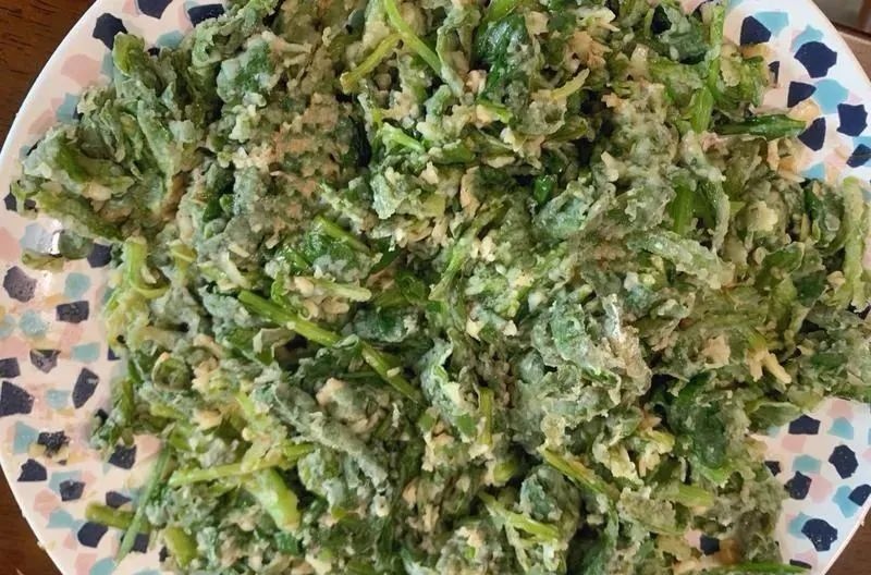 有些大厨会建议在菜叶上淋上一点油再裹面粉,这样菜叶间不容易粘连。但其实只要按照上述方式处理好菜叶,再注意裹粉的技巧,也能避免粘连成坨。