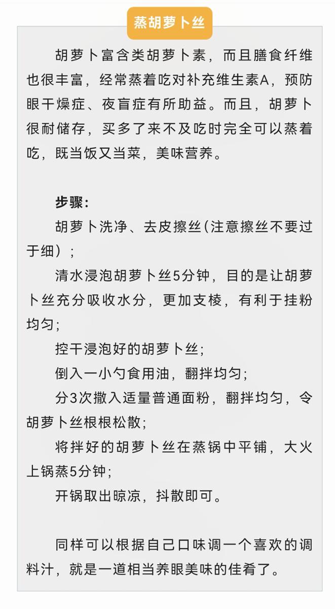 有研究显示,蒸菜的维生素C保留率可高达90%以上,远高于水煮(大约60%)。而且,不仅是像维生素C这样的水溶性营养素保留率更高,即便是胡萝卜素这样的脂溶性营养素,蒸菜的保留率也比油炒胡萝卜丝的保留率更高,这大概得益于蒸胡萝卜丝外层的裹粉,阻挡了高温和氧气对胡萝卜素的破坏。
