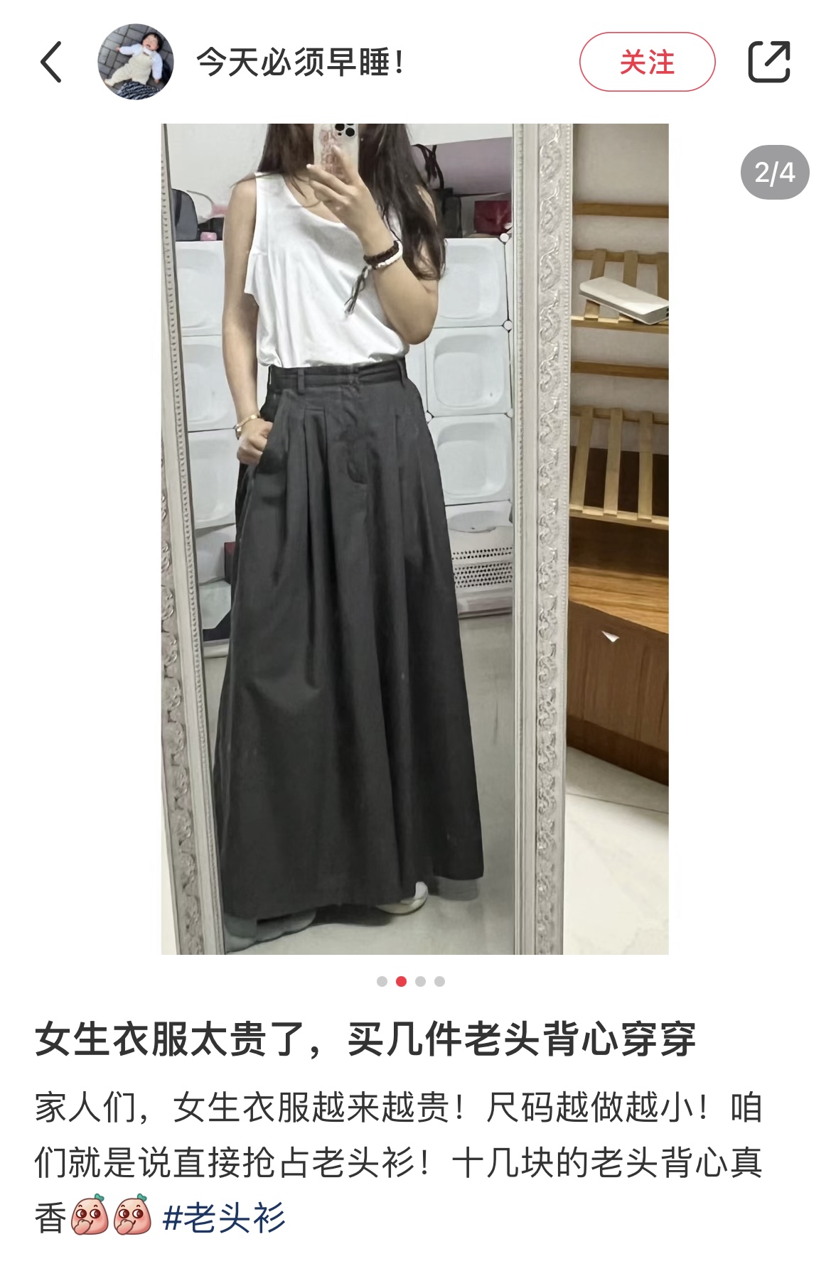 “周末穿了个公园大爷同款背心出门喝咖啡,没有束缚的感觉不要太棒!”一位网友说,一件老头背心、一条阔腿裤或工装裤,是她今年夏天最凉快的穿搭,每次穿上出去遛弯,瞬间就懂了公园老大爷的快乐。进入秋天,外搭一件衬衫,一套毫不费力的穿搭也完成了。同样,对00后女孩小许来说,老头背心除了平价、凉快,还有一个重要原因是:“可以把它看成基础款,无需费力搭配,叠穿、内搭,随便穿都能很帅气。”