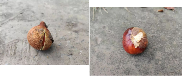 看外壳,板栗斗上的刺又密又长;而马栗外壳上的刺稀稀拉拉的,更秃一些。