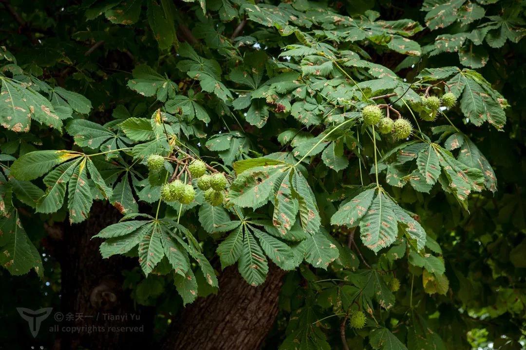 每年9月底-11月,七叶树的果实迎来了成熟的季节,稀疏刺的绿色外壳微微裂开,内部长得像栗子一样的种子若隐若现。