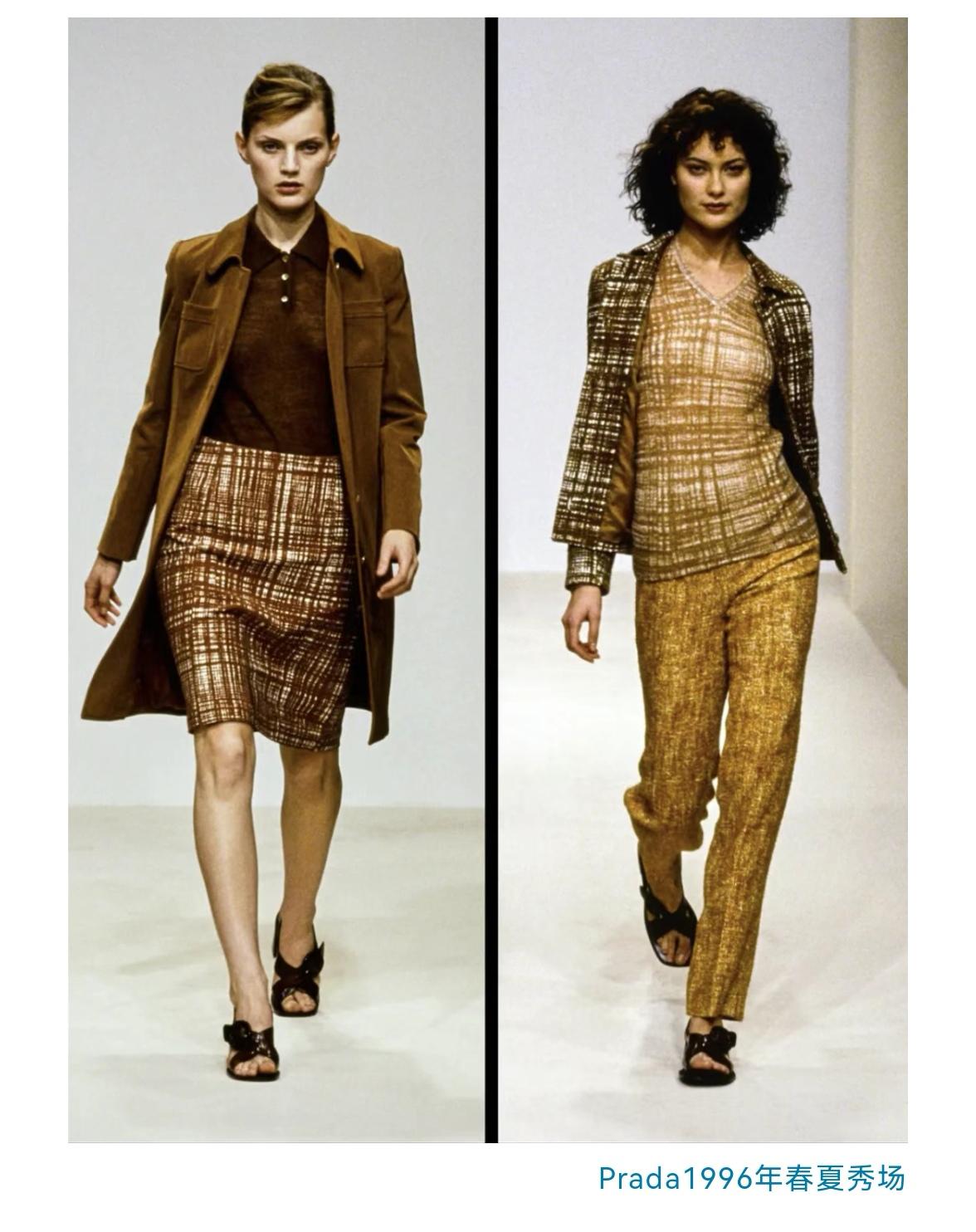 直到Prada以1996年春夏秀场,发起了一股势不可挡的“审丑风潮”(ugly chic),很多刻板印象随之改变了,其中就包括棕色的时尚地位。那场秀中牛油果绿、姜黄色、如污泥般的棕色混合在一起,与格子呢、60年代厨房专用的格纹印花贯穿在A字裙、马球衫或女性通勤的三件套制服中,统统都违背了1990年代的性感意象。当时在场的时尚媒体像发现新大陆一样对眼前的“规则错置”感到兴奋。有业界人士认为,也是从这场秀开始,大地色系重新被时尚圈“发现”了。
