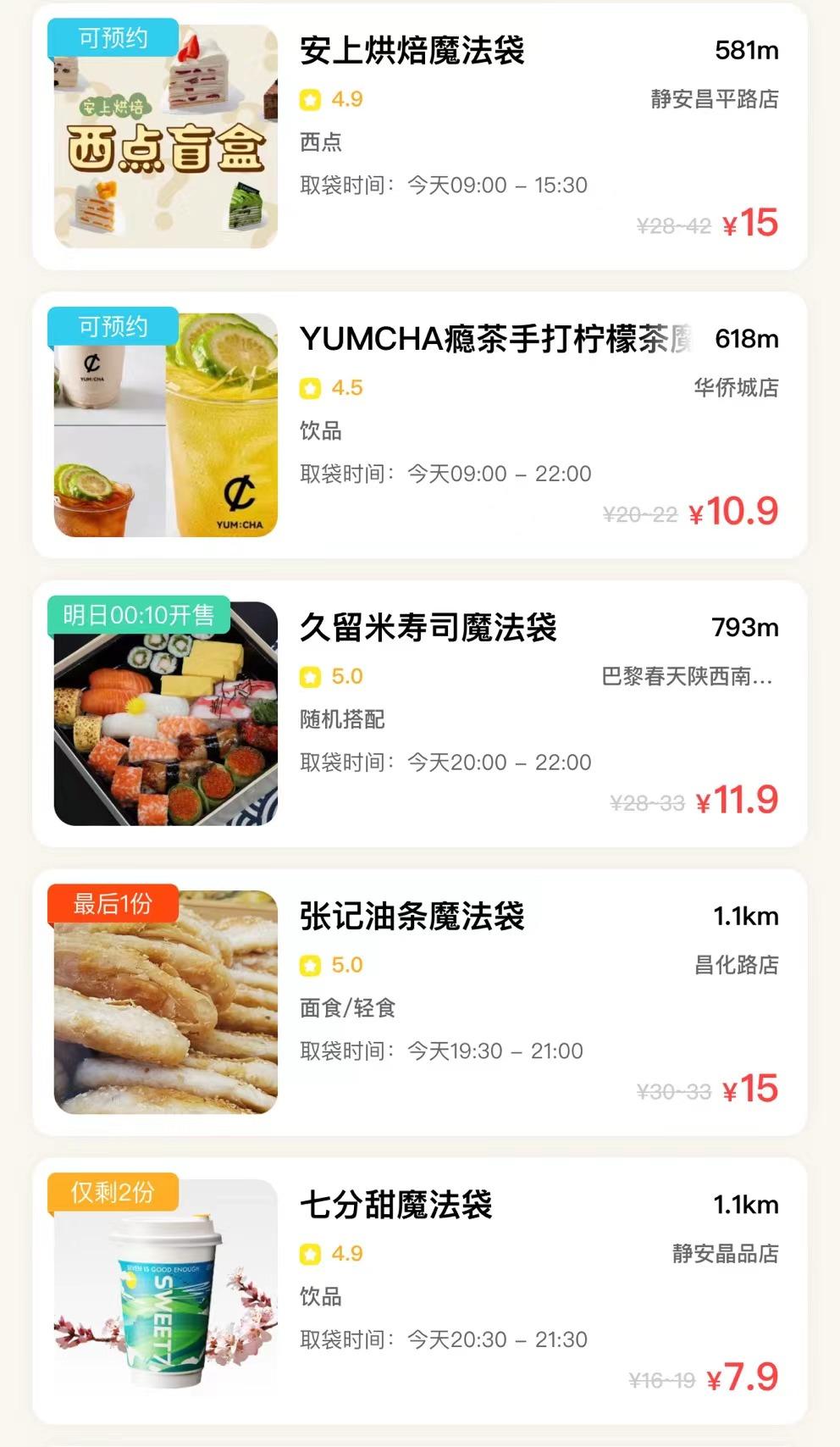 花11.9元准备好第二天早上的超值早餐、15.9元买到原价30元的面包甜品、19.9元品尝价值40元的多口味寿司……这样“好玩、省钱、环保”的盲盒,让越来越多的年轻人逐渐加入抢购大军。出于好奇,笔者尝试用剩菜盲盒平台“惜食魔法袋”小程序下单,打开小程序界面,首先映入眼帘的是“减少食物浪费,应对气候变化”的标语。通过定位,笔者发现周边有很多西点、寿司、面食类商家正在开放抢购。
