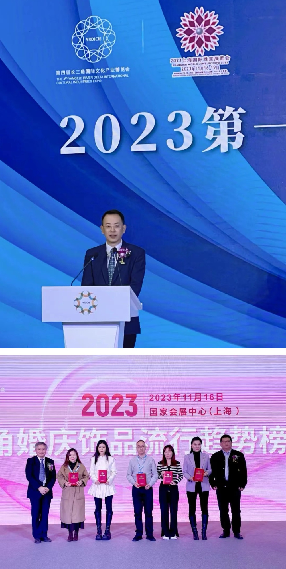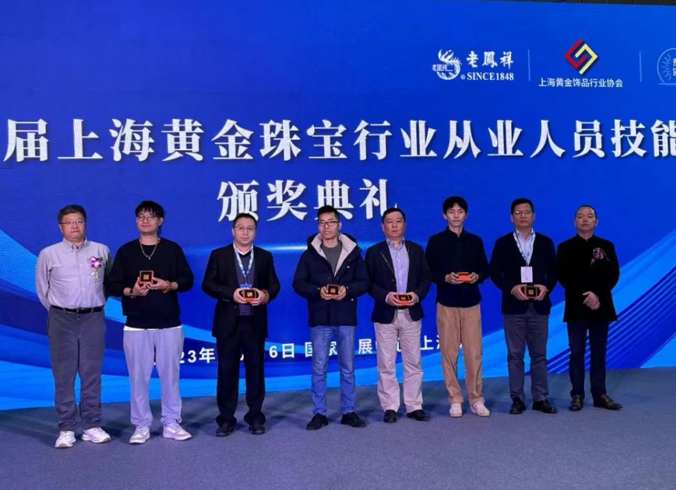 上海黄金饰品行业协会会长、老凤祥股份有限公司董事长杨奕出席开幕式并作欢迎致辞。老凤祥股份有限公司工会副主席周金祥、老凤祥设计中心主任黄雯代表企业领取“第一届上海黄金珠宝行业技能大赛奖”和“长三角婚庆流行饰品奖”。上海老凤祥有限公司市场部副经理卢晶和中国工艺美术大师黄雯接受媒体采访,介绍品牌展位亮点。