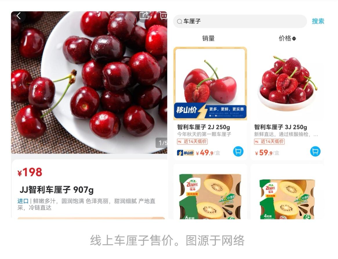 那杭州商超有没有上车厘子,价格多少?打开“盒马”“山姆”等APP搜索发现,便宜的2J车厘子一斤在100元左右,3J的一斤在120元左右。线上外卖平台的普通车厘子一斤大约在180元左右。