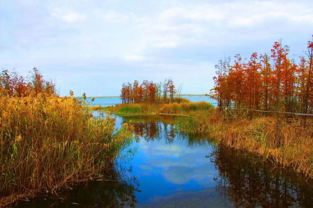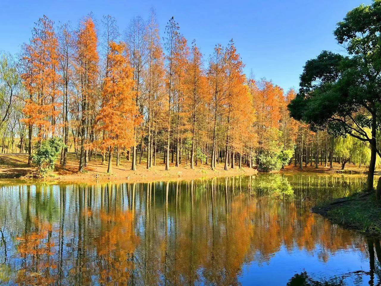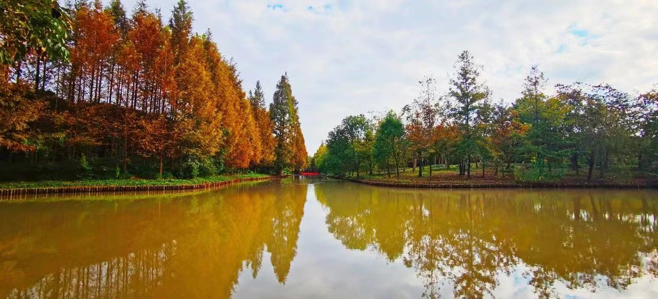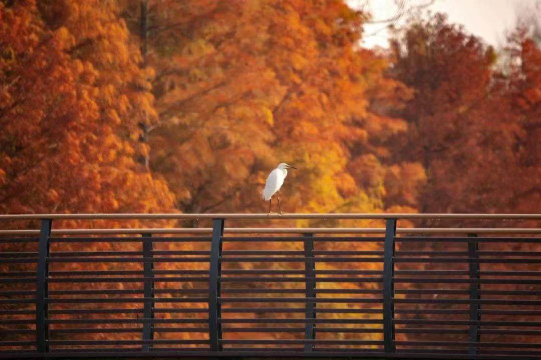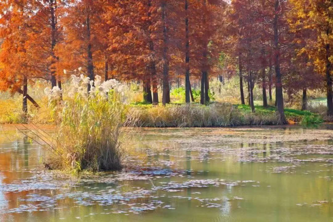湿地是水域和陆地之间的交错带,能够涵养与调蓄水源,连接水陆生机。湿地中错落有致的杉树林到秋季便一片橙红,与芦苇荡交相映衬。恍然间,未觉池塘春草梦,阶前梧叶已秋声。