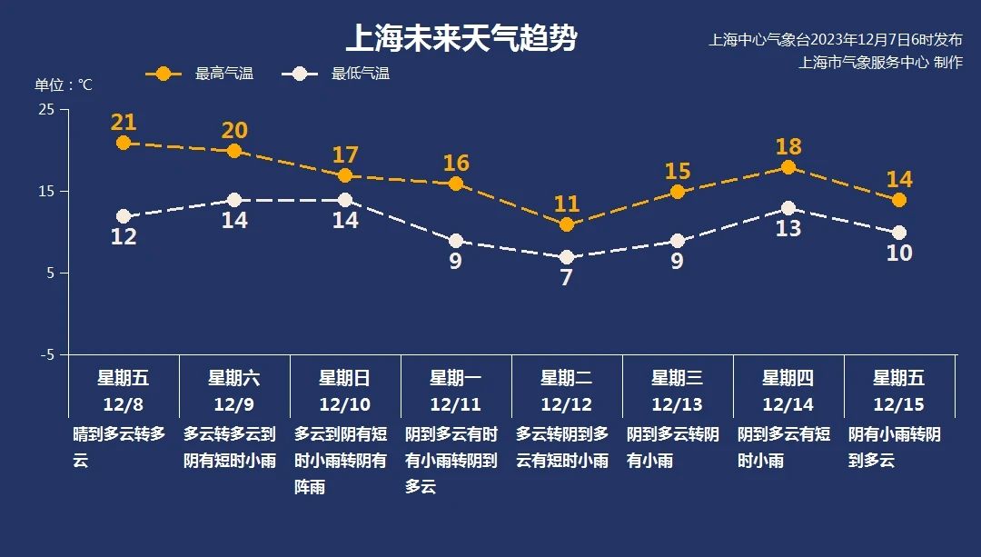 与小雪节气一样,大雪这一节气名反映的是气温和降水变化趋势,大雪到来意味着天气将越来越冷,降水量也会随之增大。根据节气法划分季节,大雪是冬季的第三个节气,但最近又有消息说上海本轮入冬失败,这是怎么一回事呢?气象意义上,将平均气温连续5天低于10℃算作入冬的标志,从11月30日起,上海已连续4天日均气温低于10度,但12月4日的日均气温高于10度,由此宣告入冬失败。本周一开始,上海迎来了一场大回暖,未来几天,本轮升温仍将持续。根据天气预报显示,本周四至下周初,气温呈现先升后降趋势。本周六将迎来此次回暖的高峰,最高温将至22°C,周日起受冷空气影响,晴暖天气不再,随之而来的是降温与阴雨天气,“湿冷魔法攻击”即将到来,建议大家做好准备,应对回暖之后的降温。