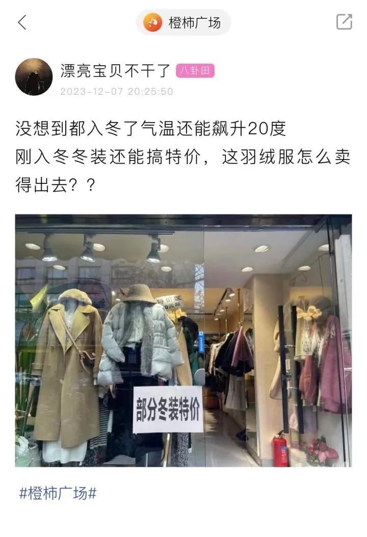 冬天的进度条又倒退了,“大雪”节气刚过,杭州的最高气温却冲上20多摄氏度。这个暖冬,羽绒服出场的机会太少了。昨天中午,杭州街头竟然还有穿短袖的人。有人在逛街时发现了羽绒服的2折店:“刚入冬,冬装就在搞特价了,这羽绒服怎么卖得出去?”