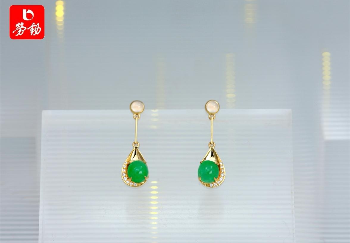 最后,这款由趣味几何元素组成的耳饰也出彩。它采用蛋面绿翡翠,结合水滴形18K金,并配以钻石和冰种翡翠,呈现出明暗交错的视觉效果,非常灵动。这款耳饰除了活跃冬日沉闷的着装,更为寒冷的季节增添了一份别样的色彩。