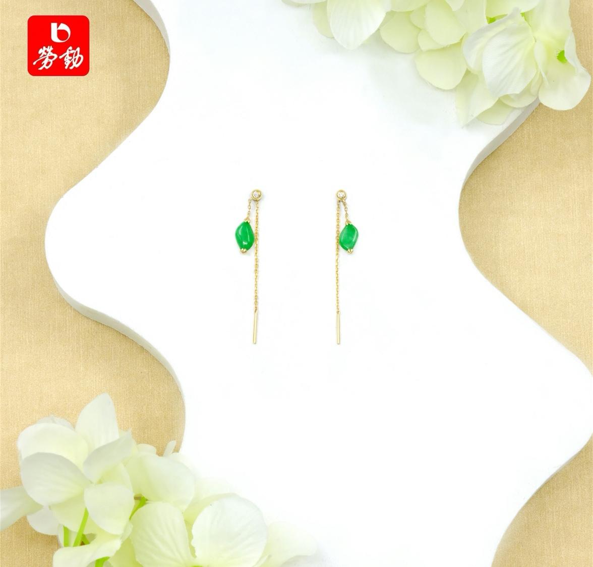 首先,看一款随型绿翡翠耳线款耳饰。它采用了翡翠和钻石的完美结合,展现出了精致而温婉的气质。修长的款式极好地修饰了脸型,增添了女性神秘之美。再配上如今流行的“新中式服装”,即使是在寒冷的冬天,也能焕发出暖暖的光芒。