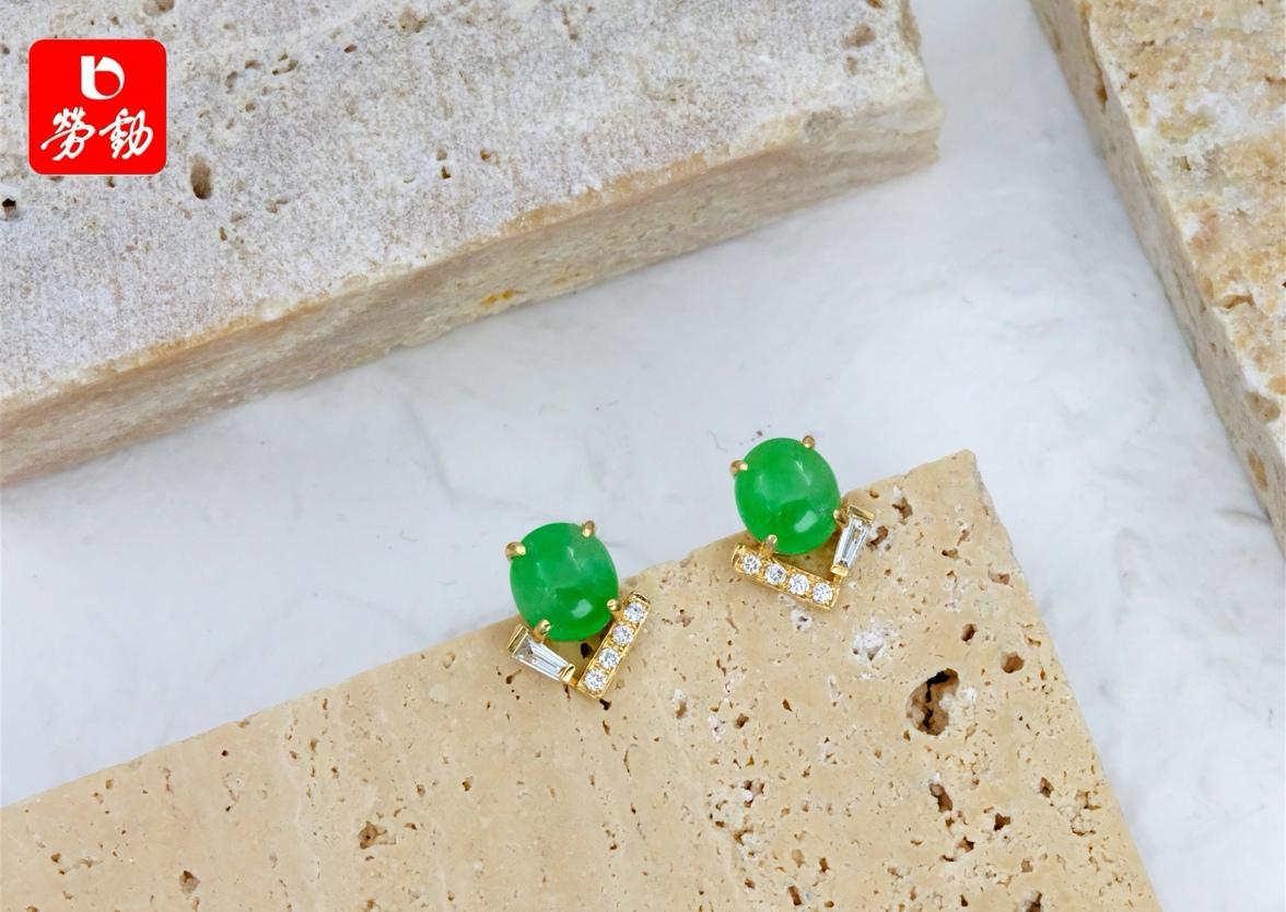 其次,一款蛋面绿翡翠耳饰,它巧妙地结合了梯方钻和圆钻,形成了时髦而独特的集合廓形。这款耳饰更能体现甜酷女孩的时尚态度,正是冬日中彰显个人风格的不二之选。