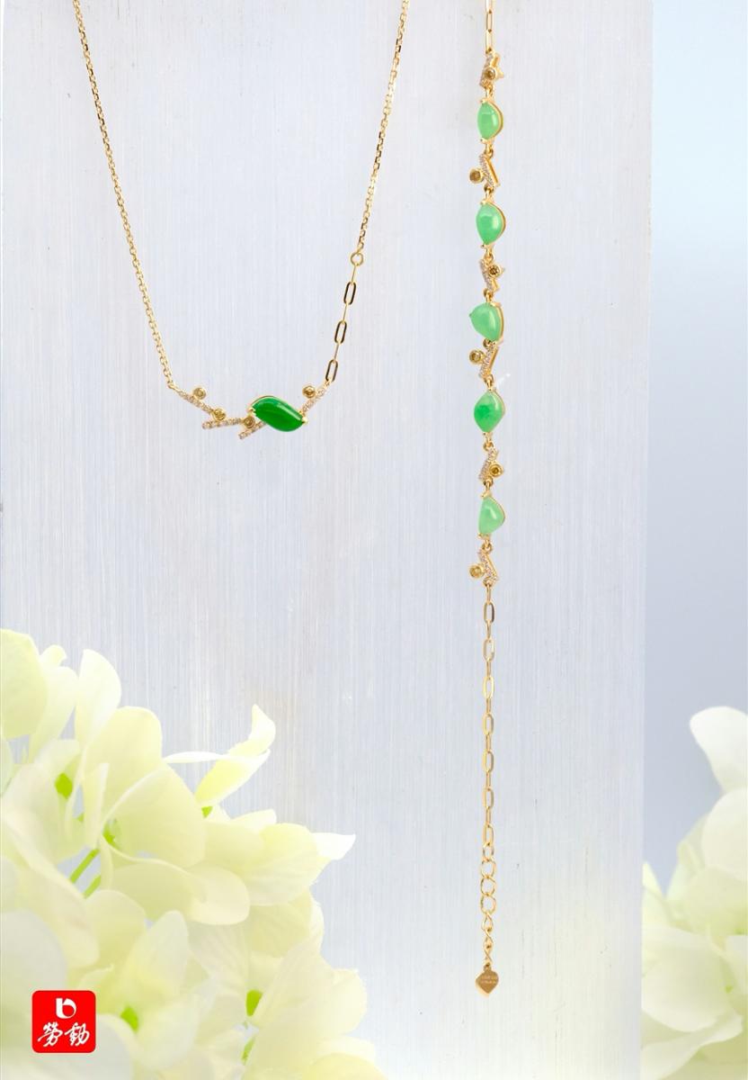 老凤祥计设计师想到了叶子形的绿色翡翠:金色的链条串起嫩芽色的多颗翡翠,好似绿柳枝刚抽出的嫩芽,这样精美细巧的手链戴在藕节般白嫩的手腕上,玉手纤纤柔若柳丝……举手投足尽显优雅秀丽。首饰挂件,单颗叶子形翡翠色泽浓绿,更能映衬出肤色白皙,日常穿搭配白衬衣清新优雅。