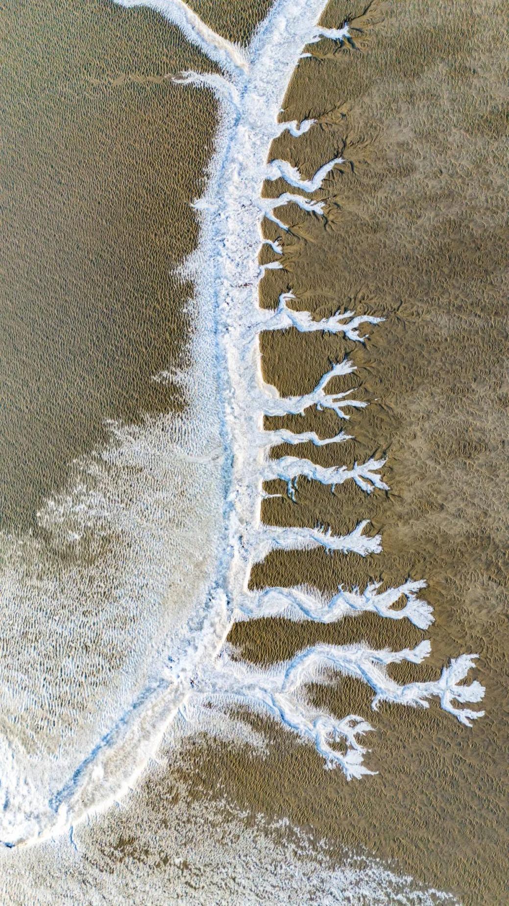 其实,“潮汐树”并不是某种植物,而是潮间带地貌中的一种奇特现象。一般形成“潮汐树”,需要满足两个条件:一是内因,即“潮汐树”所在潮滩的质地松软易被侵蚀,一般泥沙含量较高;二是外因,即要有外在的水力作用,“潮汐树”一般伴随潮汐作用“生长”,涨潮落潮时带来和冲走泥沙,日复一日冲刷出来的潮沟会越来越深、越来越长,形成“潮汐树”的主干,向内陆不断延伸。同时,在侧蚀和溯源侵蚀的作用下,“潮汐树”逐渐“枝繁叶茂”,形成了一棵棵“参天大树”。