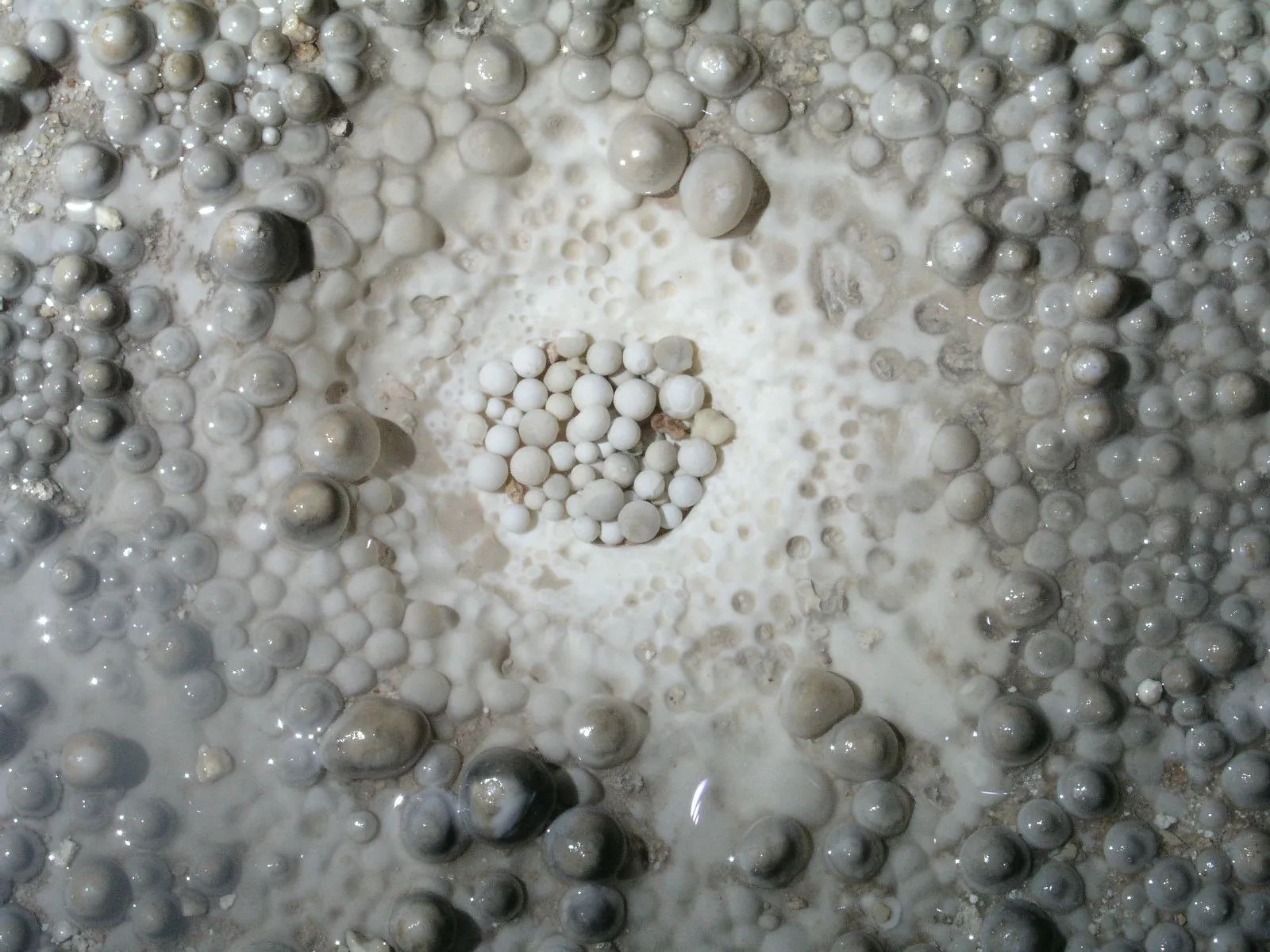 还有一些洞穴里也会出现像珍珠一样圆滚滚的石头,也是碳酸钙围绕沙粒生长而成。只不过这一过程中没有生命的参与,和钟乳石的生长类似,只是矿物从溶液中不断结晶出来的产物。在我国云贵地区的溶洞里就可以看到许多这样的洞穴“珍珠”。