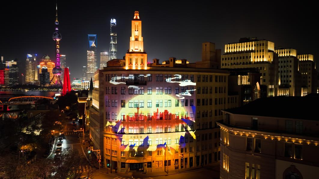 为迎接元旦等节日,位于苏州河畔的百年老建筑光陆大楼推出“樱花谷道——依依苏河绘成诗”为主题的创意投影作品,以苏河印象为背景,以樱花谷为关键元素,以光影为笔,描绘上海“一江一河”夜游新画卷。