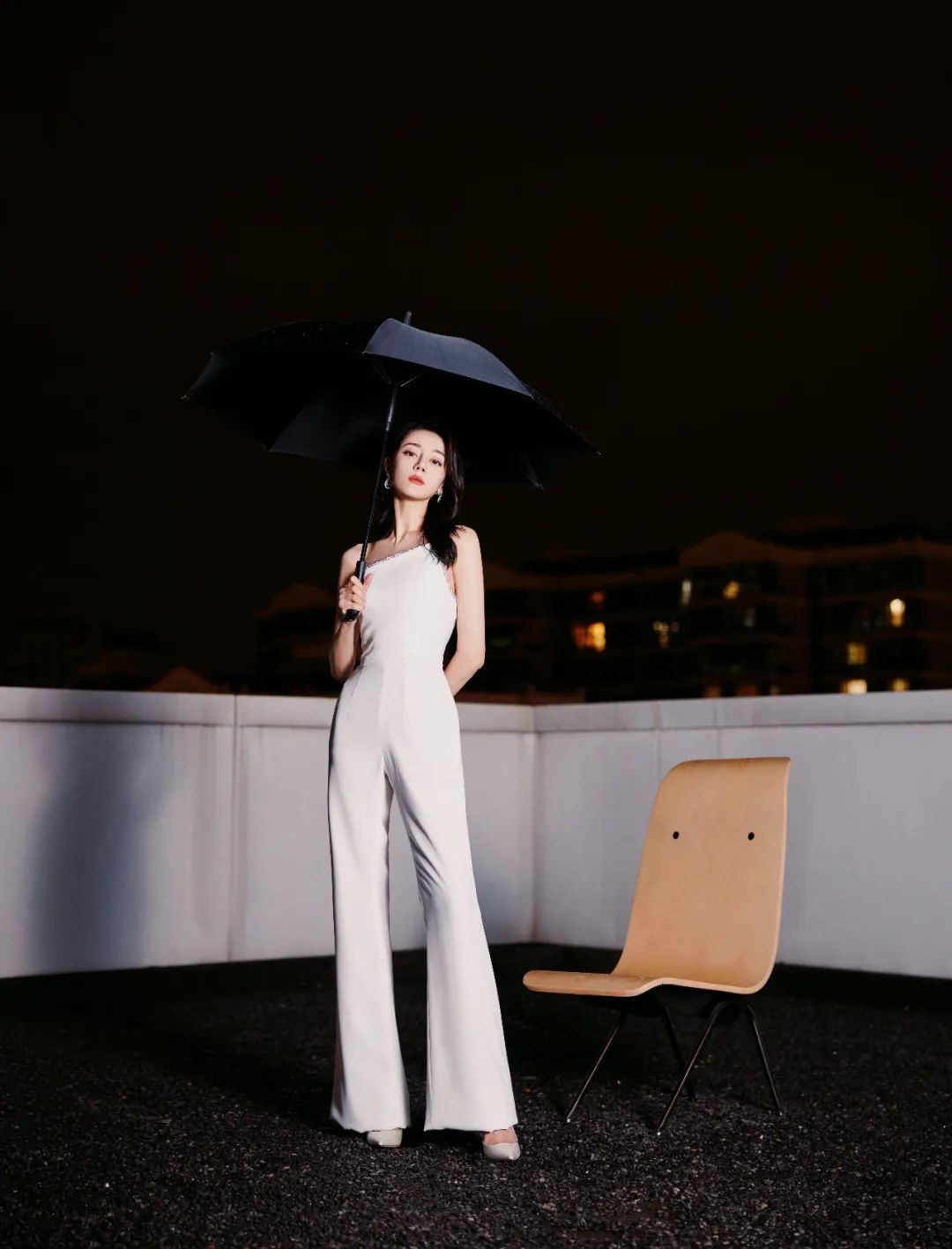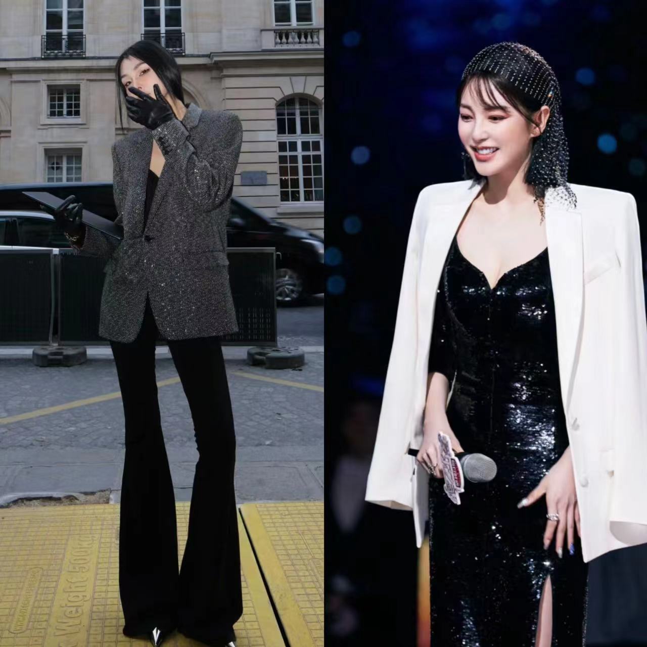 还有像迪丽热巴这样的西装材质连体裤,有不对称设计的,更能体现与众不同。搭配亮钻、金属的配饰,不用红唇就能气场满满。