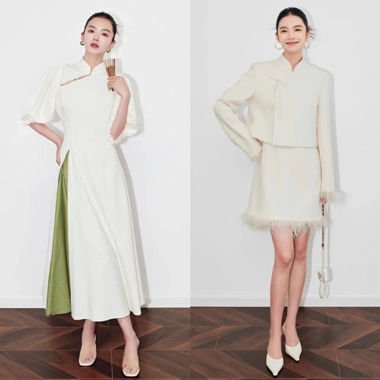 既保留了传统中式服装里盘扣、立领等经典元素,又结合了小A字、泡泡袖等现代服装版型,是传统与现代、复古与时尚的融合与交织,年会穿搭想“别出心裁”又“不动声色”,一定要试试国风元素。