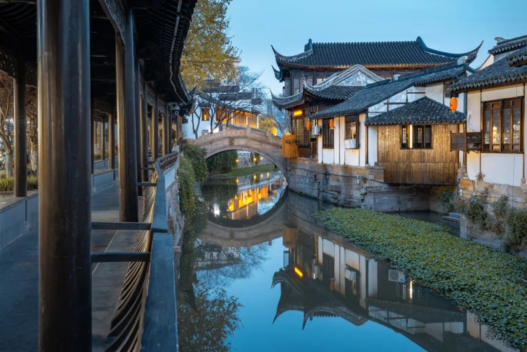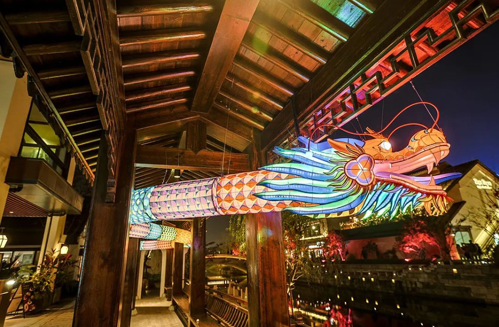 落日之时,街灯亮起,斜晖交映,倒影澄鲜。来自传统灯彩的工艺,注入现代色彩的旖旎,带你感受江南意趣的璀璨冬景。
