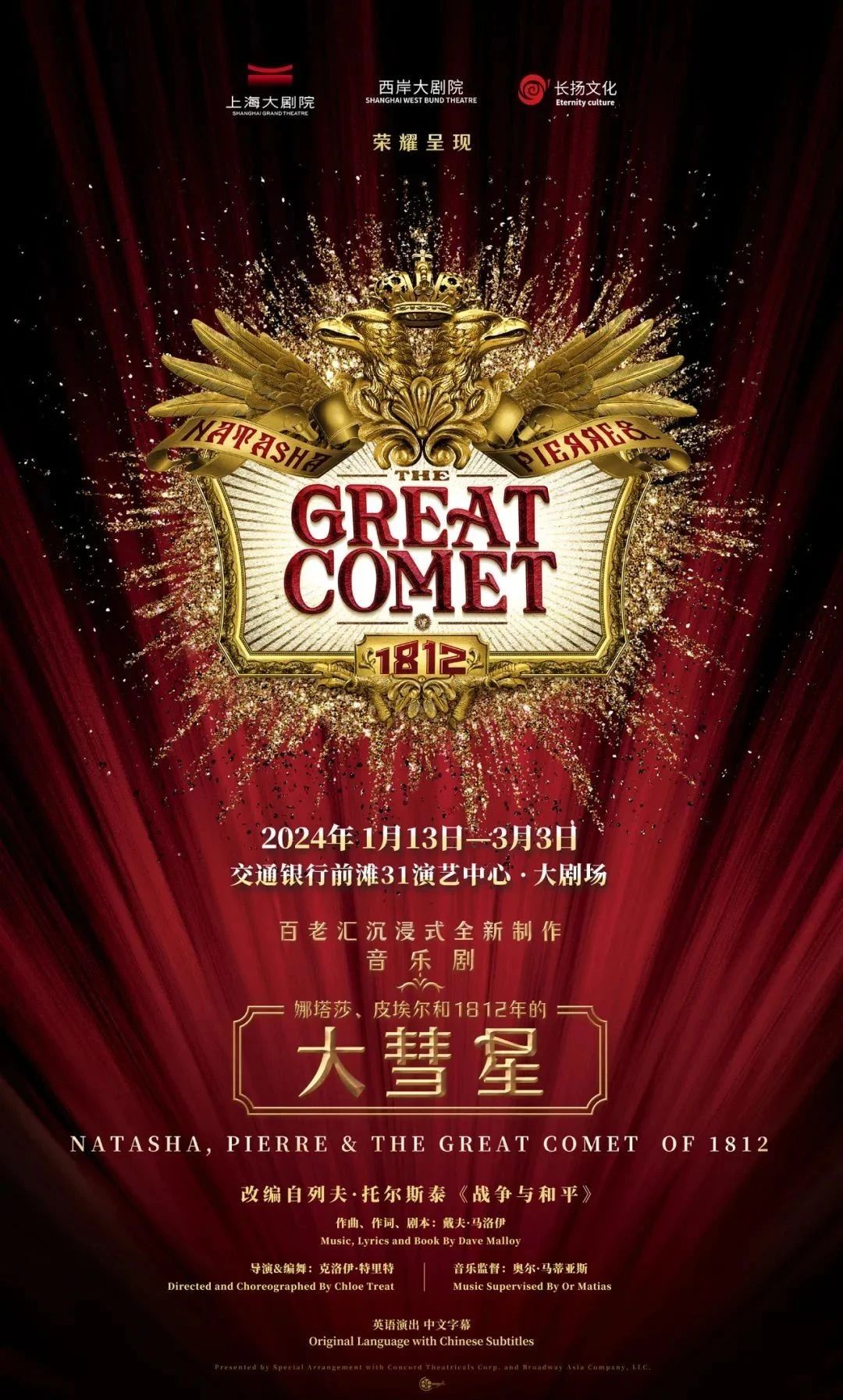音乐剧《娜塔莎、皮埃尔和1812年的大彗星》改编自托尔斯泰的文学巨著《战争与和平》,该剧于2016年登上百老汇,2017年获“托尼奖”。《大彗星》讲述了天真烂漫的少女娜塔莎陷入和花花公子阿纳托尔的爱情幻想,却被现实重创,中年醉汉皮埃尔在“挽救”娜塔莎的过程中,也为人生重新找到了方向。
