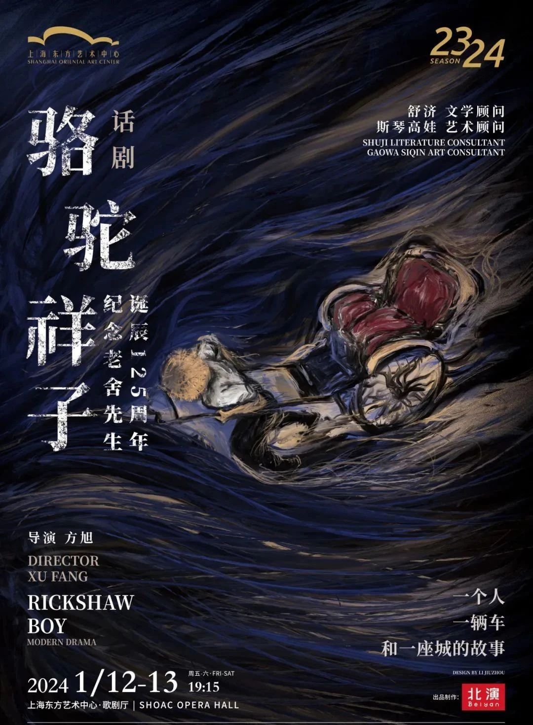 2024年是老舍先生诞辰125周年,曾多次将老舍作品搬上戏剧舞台的“老舍专业户”导演方旭,继《二马》《牛天赐》等人气话剧后,又将带来全新作品《骆驼祥子》。本剧将延续方旭一贯的“大写意”风格,以当代视角营造全新的老舍印象,豪华“全男班”演员阵容,联合奉上“一个人,一辆车和一座城”的故事。