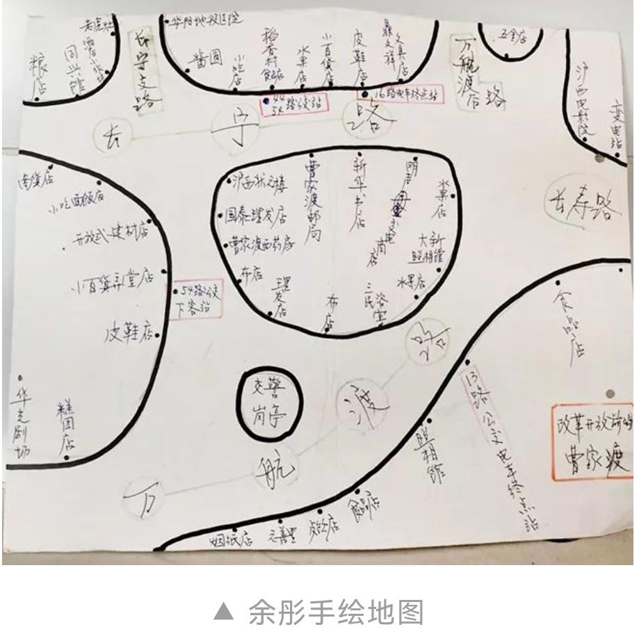 1954年,余彤一家从长宁区搬到了武定西路上的明月新邨7号,作为曹家渡的老居民,余彤利用自己的画画特长,将记忆中的曹家渡地图画了下来。