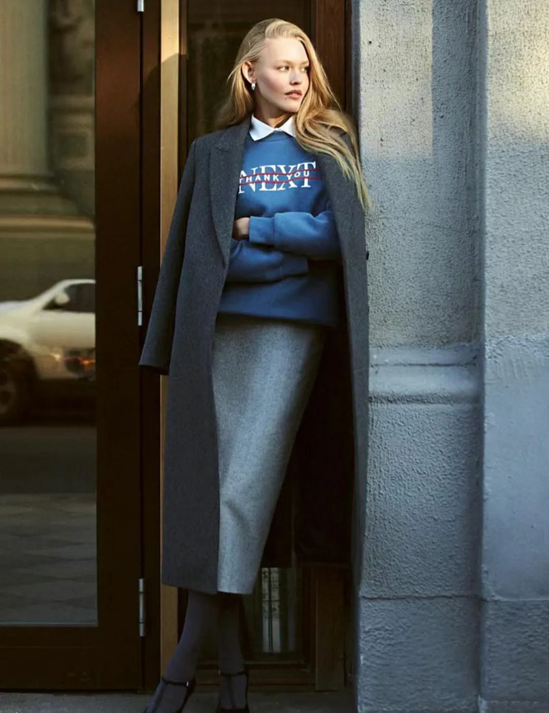 稍微进阶一下,把深浅不同的灰色叠穿起来,无论深浅跨度多大,都不太容易出错,不同明度的灰色,有着层次分明的理性力量,像深灰大衣内搭浅灰毛衣,就能让整体造型更丰富有质感。