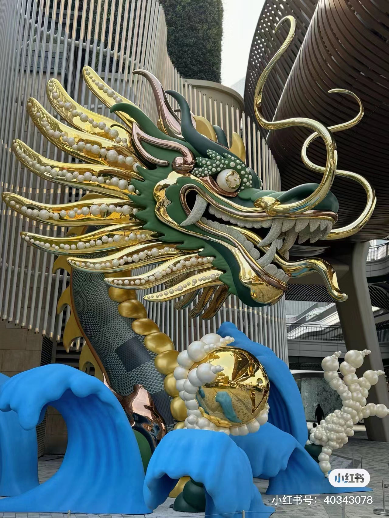 长宁来福士的龙破土而出,前滩太古里的龙踏水而来,绿金相间的龙身十分特别,在蓝色浪花的映衬下更显威严。原来,2024龙年是甲辰年,甲五行属木,木的颜色是青色或绿色,因此甲辰年也被称为青龙年,这条龙恰恰与此呼应。