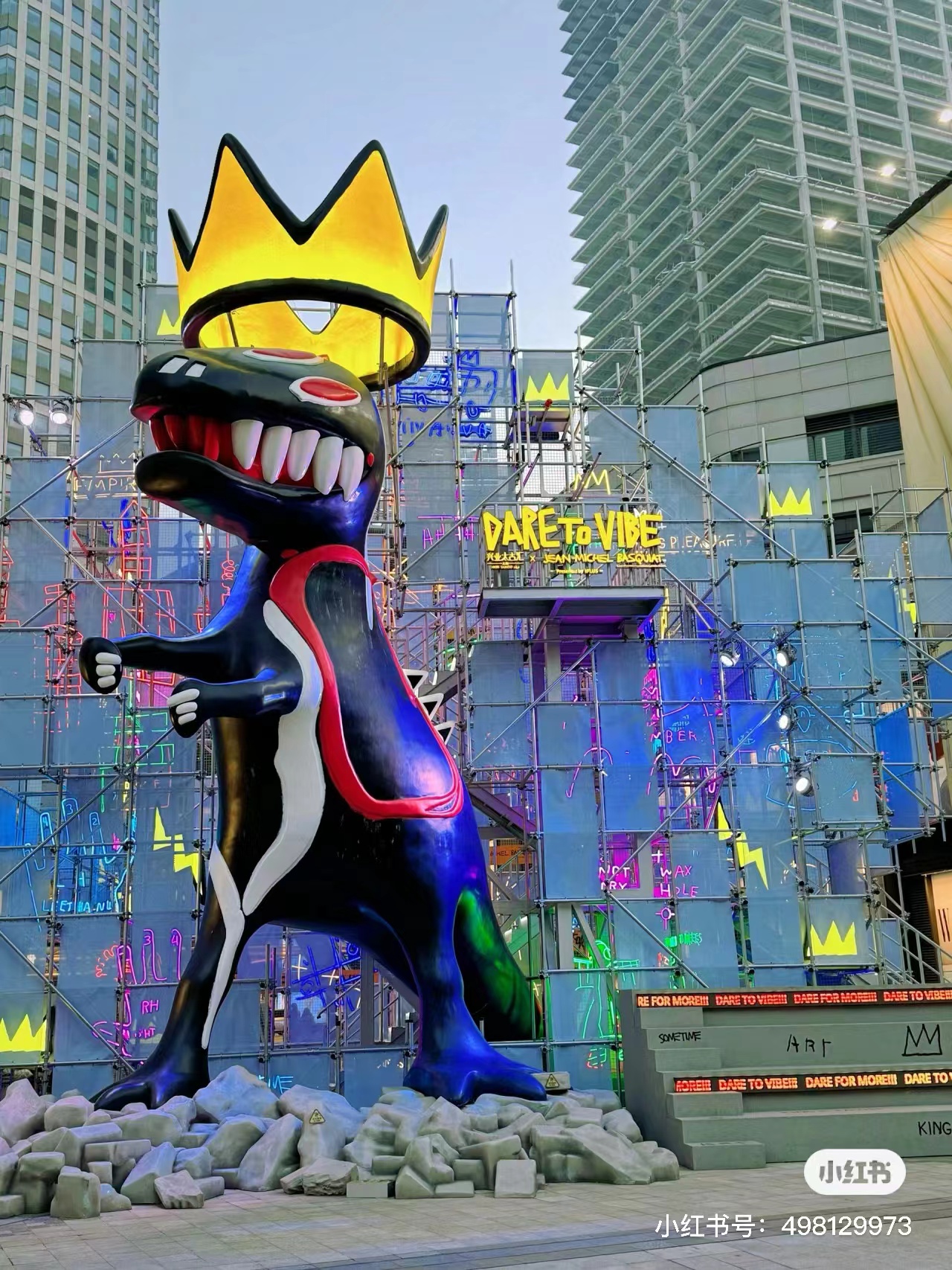 在距离红龙不远处的兴业太古汇,还有一只恐龙空降上海街头,足足三层楼高的恐龙站在广场上,头戴皇冠,十分吸睛,尤其受到小朋友们的喜爱。夜晚,恐龙背后的各色霓虹灯亮起,别有一番味道。市民游客不仅能看这只恐龙,还可以“爬”上去,不过,人多的时候可能需要排队,登高还需注意安全。