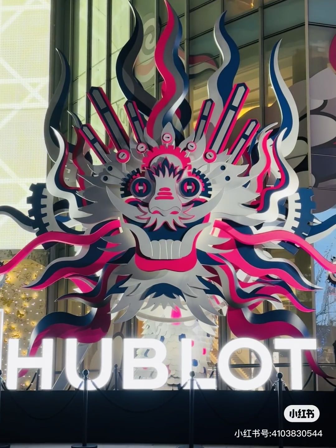 在上海恒隆广场,巨大的粉龙从建筑上盘旋而下,远远便能看见他的身影,颇有气势。走进细看龙头,发现其造型融合了传统剪纸艺术,又带有蒸汽复古的感觉,粉色、黑色、白色“三色”相融,外观新潮又时尚。