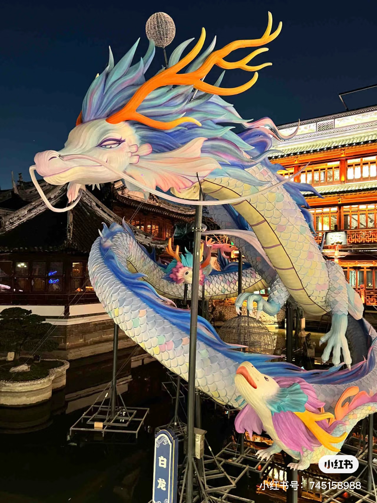 龙年临近,豫园灯会的各种装置已经就位。白龙从湖面腾空而起,栩栩如生,身边跟随着两条小龙,呼应着新年举家团圆的主题。夜幕降临后,园内灯光亮起,让人仿佛穿越到古代。春节时候,到豫园九曲桥上走一走是老上海的仪式感,走过九曲十八弯,求一个平安喜顺的好寓意。逛灯会时,不妨再找找豫园内还有哪些龙,建筑上、门楣上造型各异的龙等待你的发现。