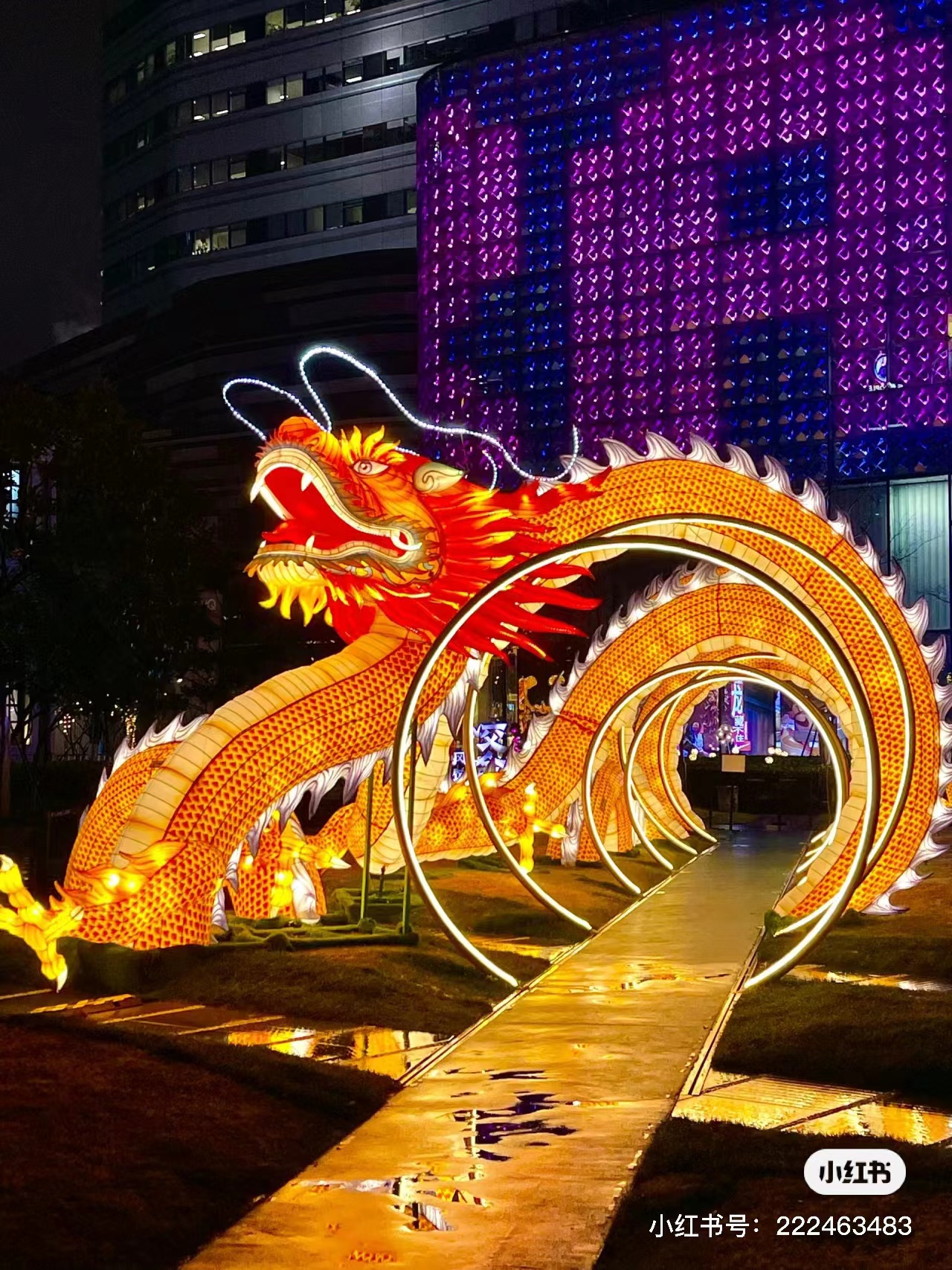 上文提到的龙或是腾云驾雾,或是盘旋在建筑外墙上,而长宁来福士的龙则与他们不同,这条龙从地面破土而出。金黄的颜色在黑夜中十分挑眼,弯曲的龙身筑起一条光影走廊,漫步灯光中,别有一番意趣。