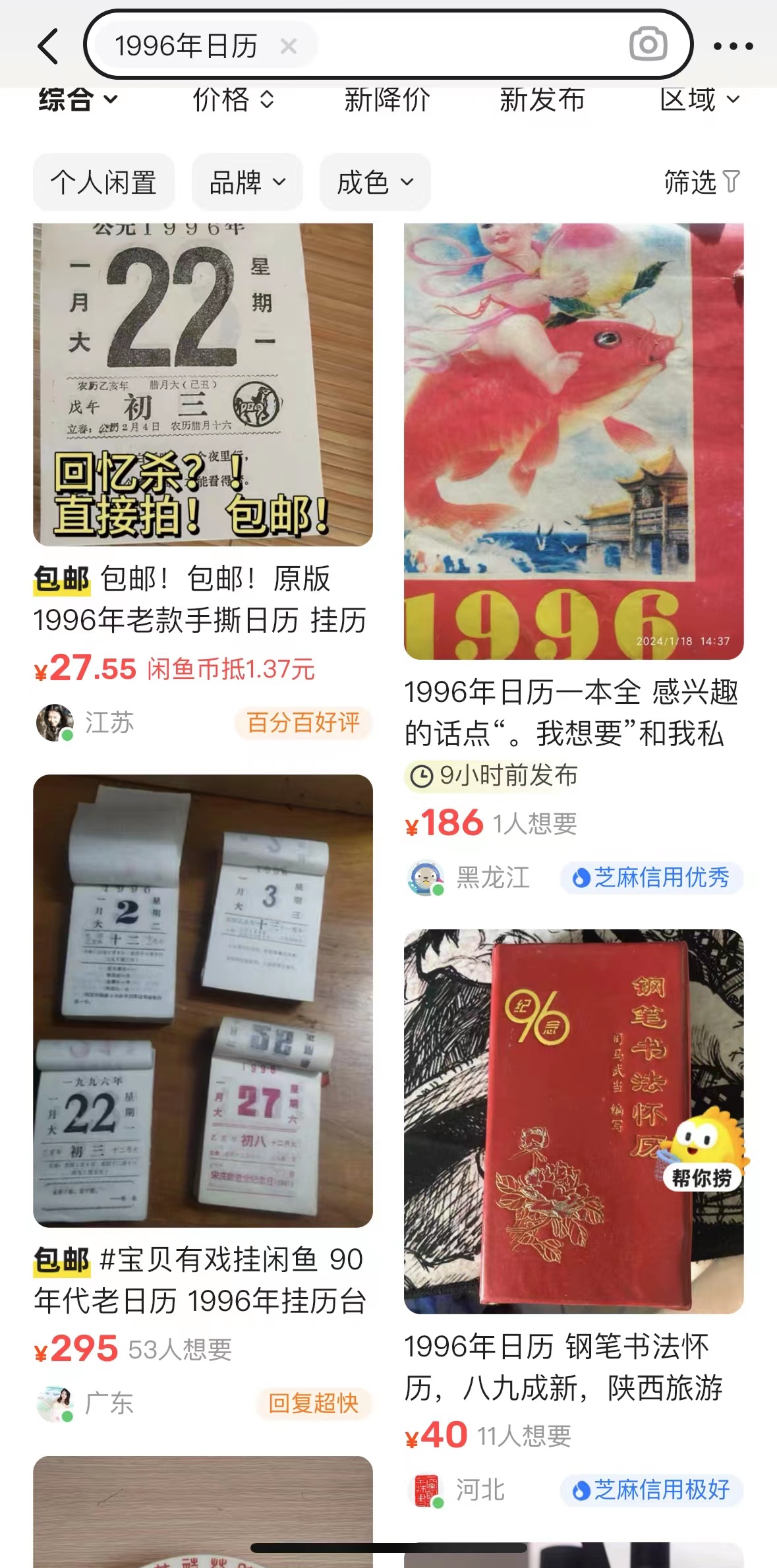 “回忆杀!1996年老款手撕日历”“96年时尚服饰海报日历,单页出”……最近,在二手交易平台上,1996年日历成了“爆款”,只因“1996年公历日历与2024年完全一样”,引得不少年轻人“买旧历,过新年”。数据显示,近一周以来,1996年旧日历的搜索量飙升600% ,不少网友感叹“有种时空交错的感觉”。