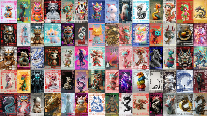 从元旦发起征集至今,全国各地的青年艺术家与AI创作者踴跃参展,送来了AIGC龙已经远远超过10000条,我们挑选了1000条首先亮相大展,每周都有新的作品更新,征集活动在继续中。