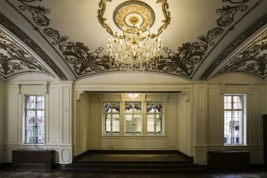 围绕楼梯的墙壁彩绘玻璃,正中雕刻着玫瑰的图案,是屋主夫妻两人爱情的象征;更重要的是女主人的英文名就是Rose(玫瑰)。