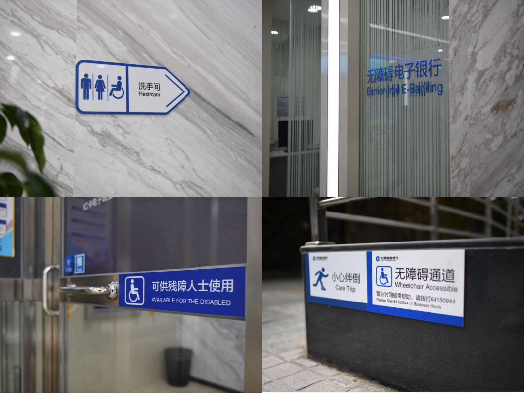 建行上海卢湾支行是上海市无障碍服务示范网点,这里有“牺牲”两个停车位铺设的无障碍坡道,有专门为残疾人设计的电动双开门,有供失明、失聪、色弱、腿脚不便等各类残障人士使用的自助服务设施,有无障碍专用取款机和无障碍专用厕所。居住在网点附近行动不便的张大爷笑称:“敢出门了,敢来银行办业务了!”