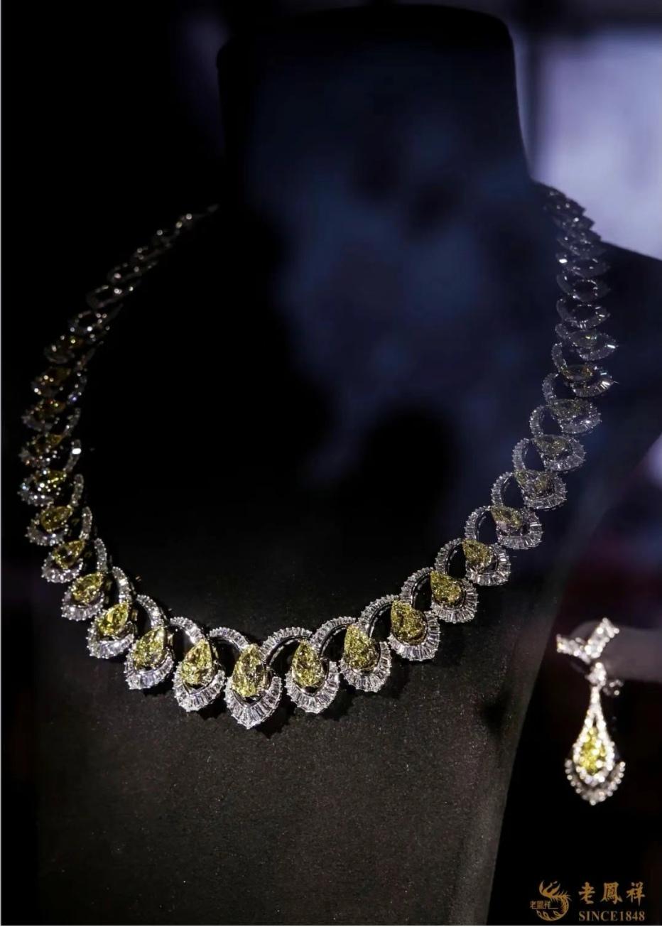 中国工艺美术大师黄雯获奖作品《如星如月》共镶嵌 25 颗高品质的梨形金丝雀黄钻,白色梯钻似羽翼展翅般围绕镶嵌, 仿佛一对凤凰神鸟在星月夜空划出的美丽弧线。