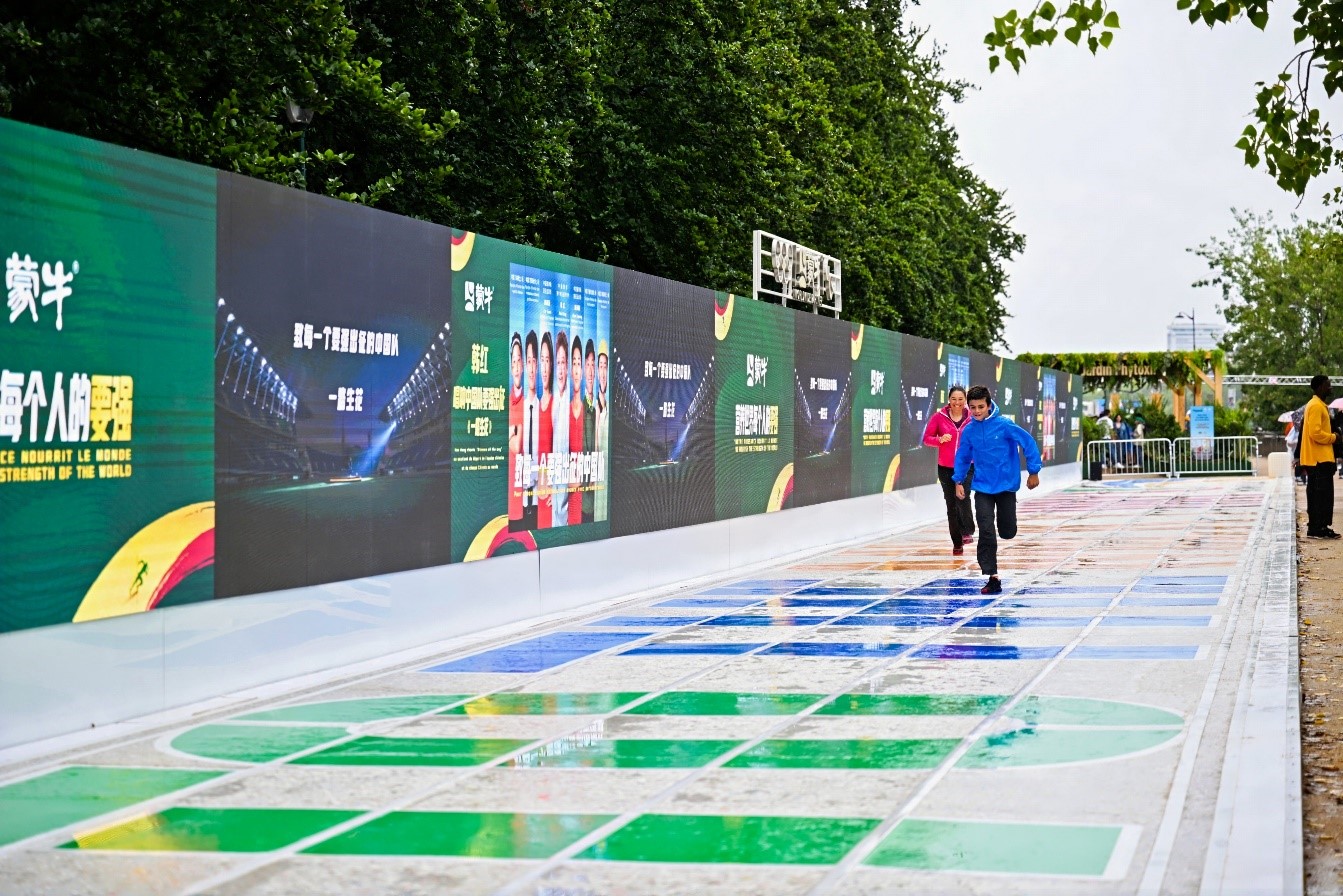 本次活动的场地颇具特色。为了更好弘扬奥林匹克精神、鼓励公众参与体育运动,同时倡导绿色环保的生活与发展理念,蒙牛大胆地打破空间限制,在巴黎塞纳河畔打造了一个完全露天开放的艺术跑道展区,这在奥运会赞助商站台历史上尚属首次。作为中国知名乳企,蒙牛用15万个废弃回收的牛奶盒,打造了这条近80米长的塞纳河畔“奶盒”全民跑道,让运动更开放,更环保,更多人参与,用这条跑道致敬每个要强的普通人。