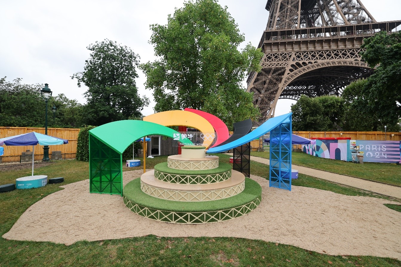 与此同时,在埃菲尔铁塔附近的沙滩排球和盲人足球比赛场地,蒙牛设立了一个140平方米的沙漠绿洲休闲区。这个区域以乌兰布和沙漠为灵感,展示了蒙牛沙漠绿洲有机牧场的独特魅力。乌兰布和沙漠位于中国北部,蒙牛在此地建立了目前全球最大的有机原奶生产基地,通过16年的不懈努力,绿化沙漠200多平方公里,种下了9800万棵沙生树木,创造了沙漠中的绿洲奇迹。