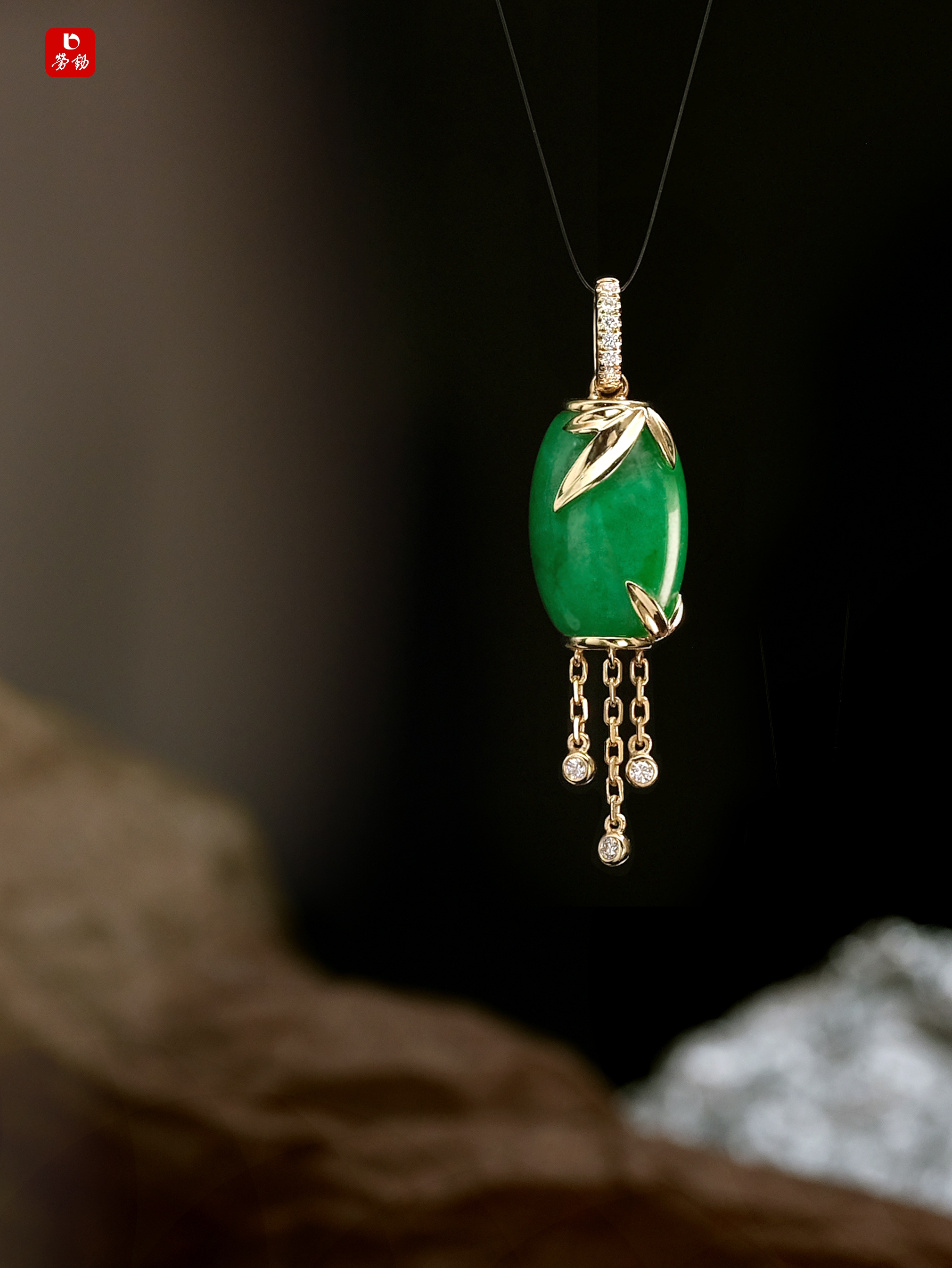 另一款,以路路通翡翠为主体造型,碧绿色泽泛着迷人光泽,18k金打造的竹叶点缀其间,婀娜多姿,丝缕流苏更添几许俏丽动人。“孤驿潇潇竹一丛,不同凡卉媚春风。我心正与君相似,只待云梢拂碧空。”这款独特翡翠佳作恰如佩戴者的独特符号,引人注目。