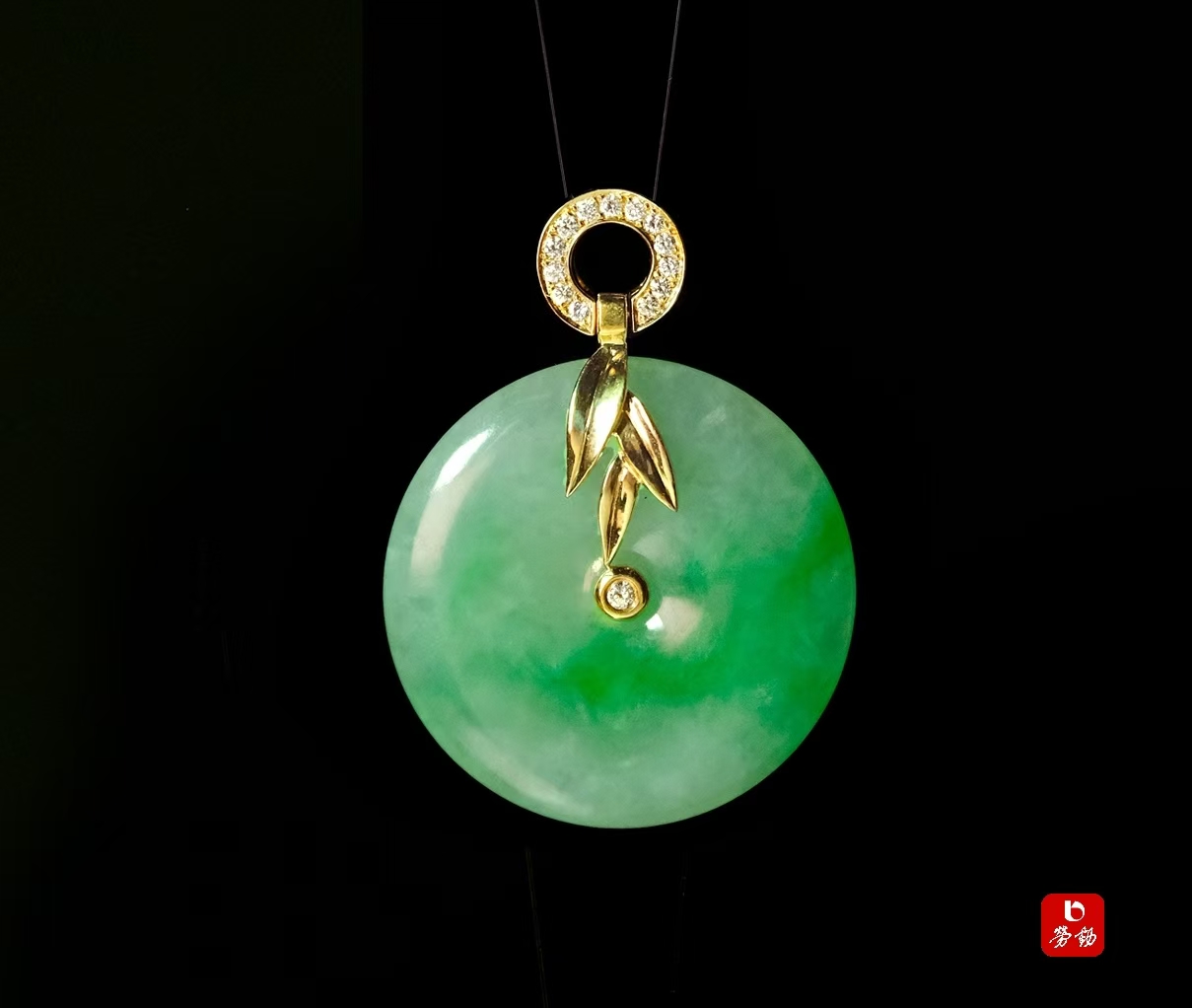 其中,一款翡翠金竹叶平安扣,碧绿润泽的优质翡翠平安扣搭配18K金打造的竹叶造型,点缀闪耀钻石装饰,整体呈现出典雅大气的视觉效果。竹叶造型丰富,既象征青春常驻,又寓意着和合美满、财源广进等美好寓意。这件平安扣翡翠碧绿与金属光泽相映成趣,“曲翠含烟,秀影浮光”营造出一种优雅沉静的气质,“千磨万击还坚劲,任尔东西南北风”,金色竹叶与平安扣的挂件让佩戴者感受到平静祥和与坚韧美丽。